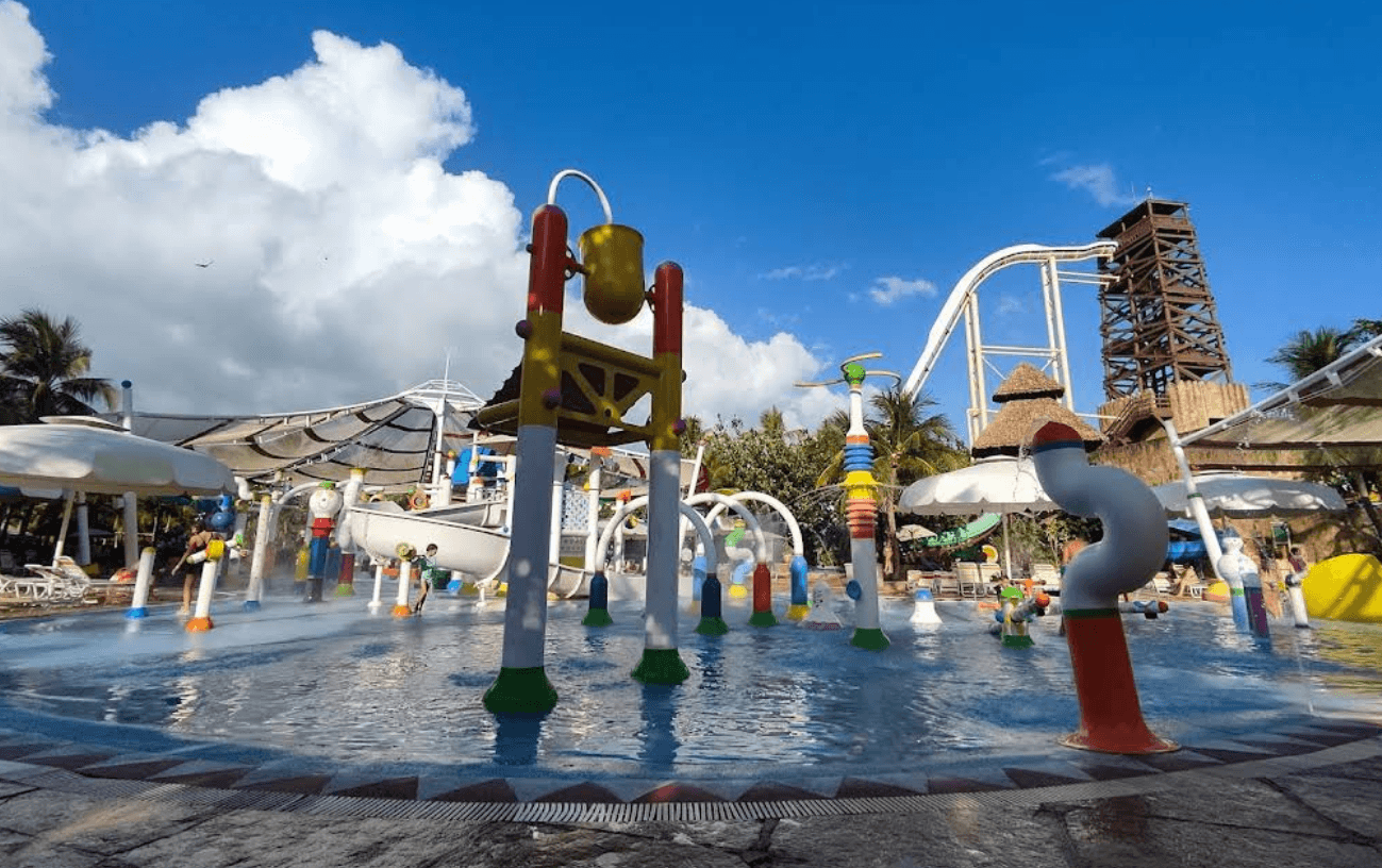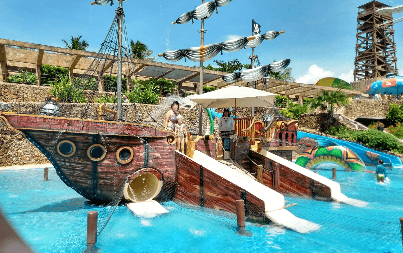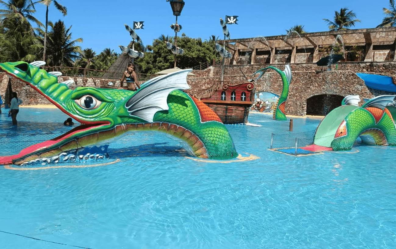 Esta área de piratas tem mastros, cordas e canhões de água interativos. As crianças sobem na estrutura e descem por pequenos toboáguas temáticos. O cenário estimula a exploração e garante horas de entretenimento infantil. É um ponto estratégico para famílias com crianças pequenas.